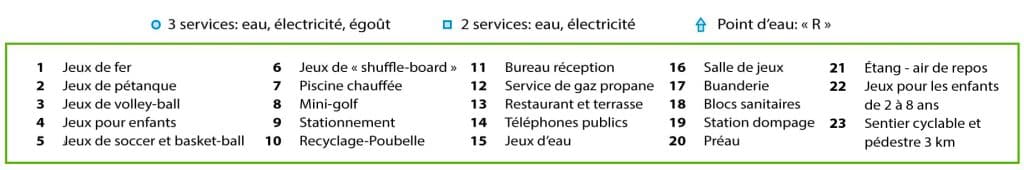 Vous pouvez cliquer sur chaque terrain en jaune (sites voyageurs), en bleu (roulottes locatives) ou les numéros qui représentent la légende au bas du plan pour ouvrir une photo.